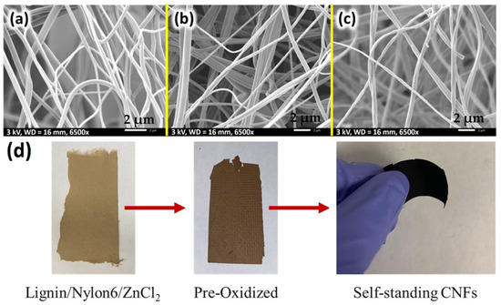 SEM images of as-blown lignin-derived nanofibers. (a) 66 wt.% of lignin (L1); (b) 80 wt.% lignin (L2); and (c) 90 wt.% of lignin (L3). Scale bar is 2 µm. (d) Images of a Z1 specimen: as-blown (left), after pre-oxidation (middle), and as a freestanding carbon electrode after carbonization (right).