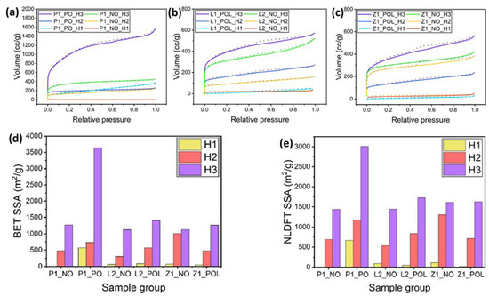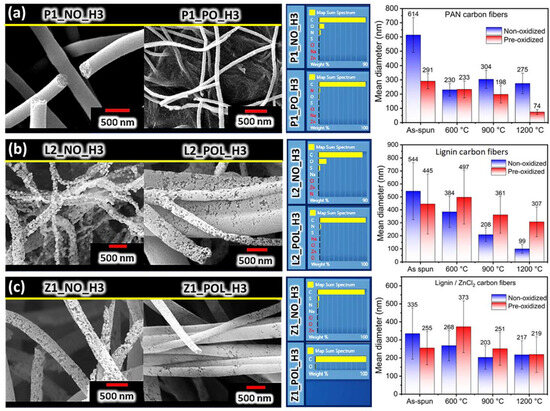 For the specimens carbonized in the regimes H2 and H3, porosity increases due to release of volatiles resulting from non-carbonizable components, such as H2O, NH3, CO, HCN, CO2, and N2. This well-developed porosity can be better detected using a gas adsorption technique such as NLDFT, which is used to estimate pore sizes and volume. Irrespective of what gas measurement technique was used (BET or NLDFT), the values of SSA increased with carbonization temperature. The SSA values also increased due to the pre-oxidation (PO) step. Note also that according to the EDS results (discussed before), SSA is related to the carbon content. For the specimens carbonized at the highest temperature (regime H3), a complete volatile release would be expected. Among these, the pre-oxidized (PO) specimens revealed a higher carbon content than the non-pre-oxidized (NO) ones, thus indicating that PO has a strong impact on removal of heteroatoms, which is also directly correlated with a higher SSA value. On the other hand, the specimens Z1_NO_H3 and Z1_POL_H3 revealed the smallest differences in the carbon content of ~4% and their SSA values were similar, irrespective of the NO or PO pre-treatment steps. The specimens derived from lignin carbonized using regime H3 revealed a larger difference in the carbon content, which can also be associated with the pre-treatment regimes, NO or PO. A significant increase in the SSA values of P1_NO_H3 to P1_PO_H3 specimens reveals that the pre-oxidation step plays a crucial role in pore formation during the carbonization of PAN nanofibers (cf. Figure 7a,b and Table S4).