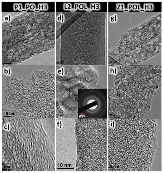 As seen in the TEM images (Figure 5), it is possible to resolve graphitic carbon layers on the nanofiber surface. Even though all the specimens revealed a similar level of graphitization via Raman analysis (discussed previously), only the lignin-derived specimen (L2_POL_H3) possessed a long-range graphitic structure, which could be detected via the SAD mode. The pattern observable in Figure 5d was most likely caused by a small casting portion of the solution, which does not have a fiber-like shape. The three diffraction rings that can be observed in the inset in Figure 5e correspond to the sizes of 0.335, 0.197, and 0.117 nm, which are reminiscent of (002), (101), and (112) in Miller’s indices of graphite [46]. The diffraction spots indicate a polycrystalline graphite [14]. In Figure S10a,b, the diffraction pattern, corresponding to that of amorphous carbon, is revealed at the fiber surface. Using Raman spectroscopy data, the BSU (basic structure unit) was estimated to be of the order of ~2 nm. In comparison, in Figure 5c,f,i, the graphitic planes can be observed, and they are of the order of 2 nm. Small graphitic domains were also detected for amorphous carbon using SAD [47].