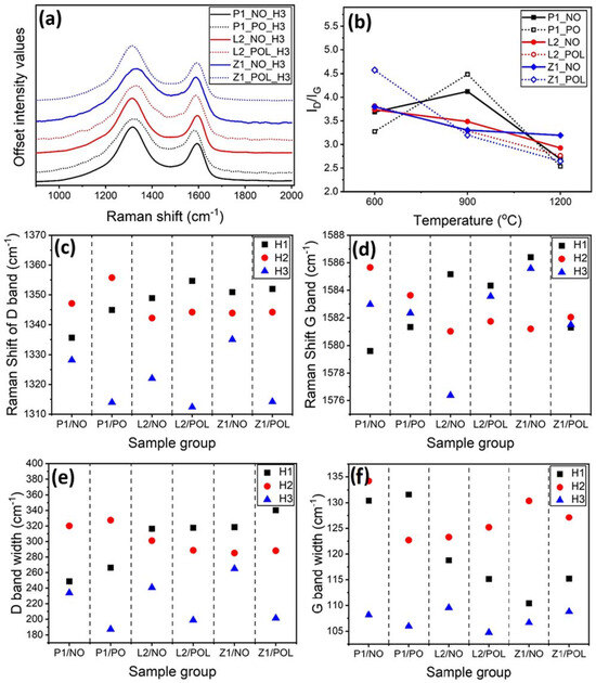 Raman spectroscopy analysis. (a) Ratio of the D and G peak areas vary with the carbonization temperature. (b) Raman spectroscopy results for specimens carbonized in the heat-treatment regime H3. The spectra and the corresponding peaks for all the specimens are presented in the Supplementary Materials (cf. Figures S11–S14). (c) The Raman shift for the D-peak around 1340 cm−1. (d) The Raman shift for the G-peak around 1582 cm−1. The peak half-widths for all specimens carbonized at different temperatures: (e) the D-peak half-width and (f) the G-peak half-width.