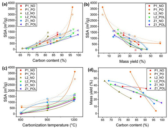 The overall results indicate that there is a correlation between the SSA value, weight loss, temperature, and the carbon content (C%). The acquired data for specimens from different groups are presented and compared in Figure 8a–c, which displays the SSA values versus the corresponding carbon content, mass yield, and carbonization temperature, as well as in Figure 8d, which presents the mass yield versus carbon content. Accordingly, a higher SSA value is associated with a high carbon content and increases with PO and the carbonization temperature. SSA is also correlated with a low mass yield (cf. Figure 8b) due to the elimination of non-carbonizable components and a higher carbon content (cf. Figure 8d).