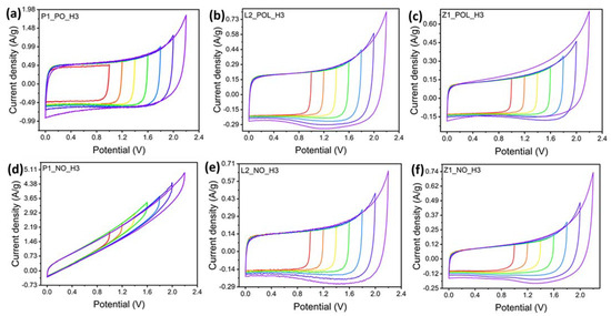 Cyclic voltammetry tests at potentials varying in the 0–1 V range and up to the 0–2.2 V range at a scan rate of 20 mV/s. (a) P1_PO_H3, (b) L2_POL_H3, (c) Z1_POL_H3, (d) P1_NO_H3, (e) L2_NO_H3, (f) Z1_NO_H3. Legend: red 0–1 V; orange 0–1.2 V; yellow 0–1.4 V; green 0–1.6 V; blue 0–1.8 V; dark blue 0–2 V; violet 0–2.2 V.