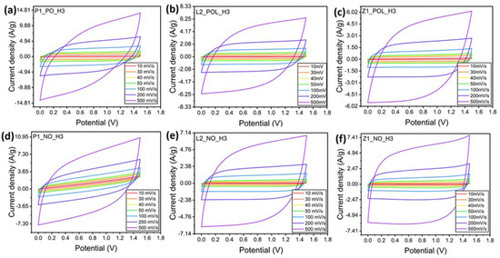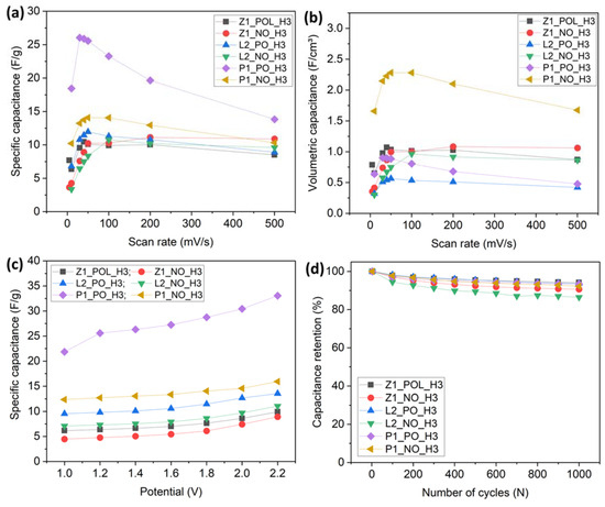 The cyclic-voltammetry scanning (Figure 10) of supercapacitors at different scan rates affects deviations from the squared shape as the ion diffusion rate increases. Accordingly, a higher electrical resistance can be observed. Figure 10 and Figure 11a reveal that the non-pre-oxidized (NO) specimens were less affected by fast charging, and the lignin-derived specimens were, roughly speaking, also less affected by fast charging in comparison to the PAN-derived ones. Figure 11a reveals that the P1_PO_H3 specimen reached its highest capacitance (26 F/g) at 30 mV/s, descending to 13.8 F/g at 500 mV/s, being the most affected specimen, with its capacitance reducing by 46% lower than its maximum. Similarly, Z1_NO_H3 was the specimen that was least affected by fast charging, with its highest capacitance (11.1 F/g) achieved at 200 mV/s, being reduced by only 2% when charged at 500 mV/s (10.9 F/g).