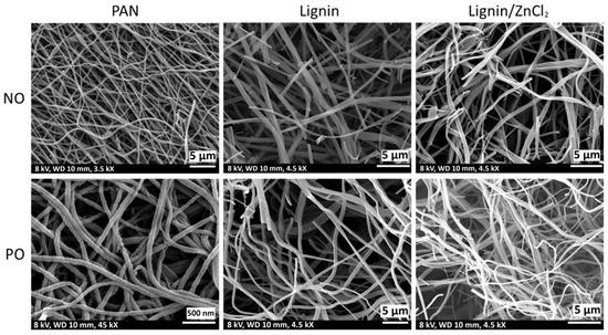 As described in the ‘Materials and Methods’ section, PAN, lignin/nylon 6, and lignin/nylon 6/ZnCl2 nanofibers were explored. Because PAN is currently widely used for the production of carbon nanofibers, PAN nanofibers were first characterized for comparisons with the literature. Then, lignin-derived nanofibers were studied, followed by lignin-derived nanofibers incorporating ZnCl2, which were used to explore whether promotes pore formation.