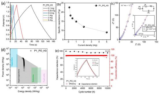 Electrochemical properties for the specimen P1_PO_H3: (a) GCD curves at different current density; (b) specific capacitance calculated via GCD curves; (c) impedance spectra collected in the 104–0.1 Hz frequency range (the equivalent circuit used for fitting the spectra is inserted); (d) Ragone plot; (e) capacitance retention and coulombic efficiency after 10,000 GCD curves at a current density of 0.25 A/g.