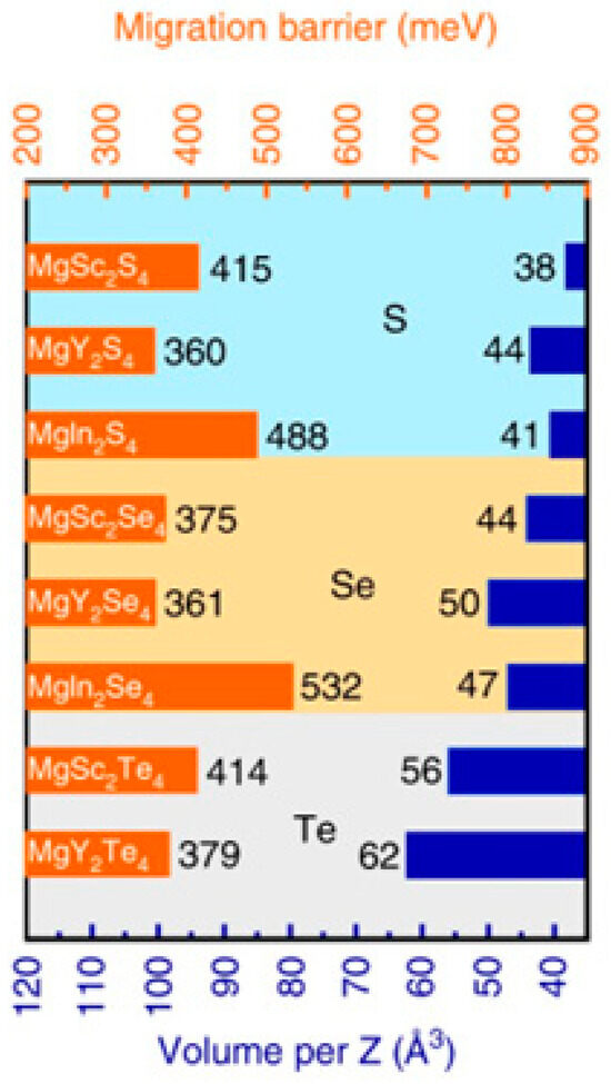 Computed Mg2+ ion migration barrier in trinary spinel chalcogenides. Reproduced with permission [42]. Copyright 2017, Nature Communications.