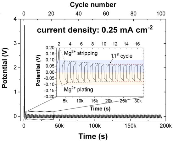 Galvanostatic cycling of a symmetric Mg/Mg(BH4)2 1.6NH3-MgO cell at 60 °C with a constant current density of 0.25 mA cm−2. Reproduced with permission [69]. Copyright 2020, American Chemical Society.