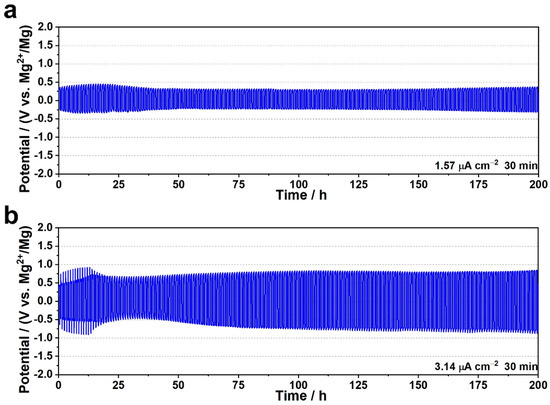 Mg plating/stripping test of UiO-66-Mg(TFSI)2/[EMIM][TFSI] electrolyte at current density of (a) 1.57 μA cm−2 and (b) 3.14 μA cm−2 at 60 °C. Reproduced with permission [76]. Copyright 2022, Wiley-VCH GmbH.