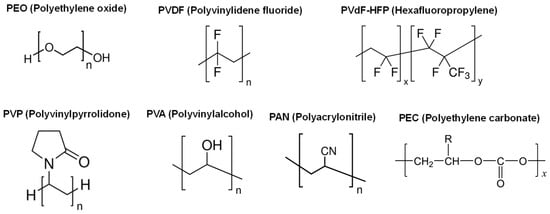 SPEs are composed of host polymers and Mg salts. The Lewis-base moieties of host polymers allow the dissociation of Mg salts, resulting in an emerging Mg2+ ion conduction. Accordingly, the host polymers contain atoms with lone-pair electrons, such as oxygen, fluorine and nitrogen atoms. Figure 5 depicts the structures of various host polymers. SPEs are prepared by the solution-casting method. Polymer hosts and Mg salts are dissolved into a solvent and then cast onto a substrate to obtain SPE films.