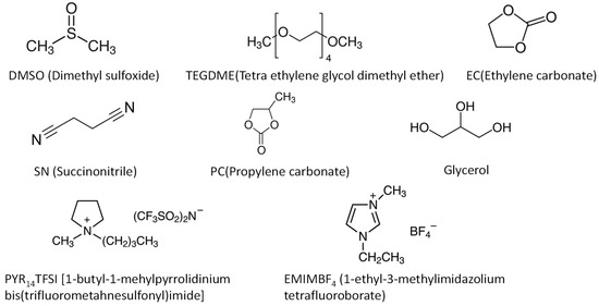 As Li+-ion conductive polymer electrolytes, low molecular weight solvents and ionic liquids have been used as plasticizers (Figure 6). Because plasticizers soften SPEs, the optimum amount of plasticizers must be found to balance the ionic conductivity and mechanical properties of GPEs. The optimum amount of plasticizers varies significantly by the plasticizers used. In the GPE using PYR14TFSI ionic liquid, the highest ionic conductivity was obtained at 10 wt.% of plasticizers [126]. Contrarily, the plasticizer amount of 200 wt.% was reported in the TEGDME system [127]. In such high plasticizer content, it is questioned whether the ionic conduction is mainly caused by the segmental motion of the polymer or dissolved Mg salt in the liquid part.