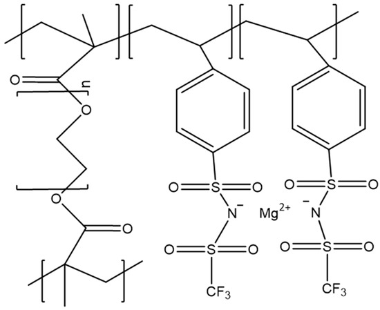 In another important study, a single-ion conductive polymer electrolyte was reported by Schaefer et al. [134]. In the single-ion conductive polymer electrolyte, the anion part of Mg salt was polymerized with host polymers. Thus, the mobility of the anion is zero; in other words, the cation transference number is 1. Therefore, undesired side reactions caused by anions can be avoided completely. The authors prepared a P(PEGDMA)-P(TFSI) [poly (ethylenglycol) dimethacrylate- poly styrensulfonyl (trifluoromethylsulfonyl)] network (Figure 7). In this structure, TFSI moiety is involved in the polymer chain, resulting in the immobilization of anion. This type of polymer generally shows a low ionic conductivity due to the low segmental motion of the polymer chain. Thus, the DMSO plasticizer was added, and the Mg2+-ion conductivity was increased to 8.8 × 10−4 S cm−1. It is noted that the high conductivity was achieved by only Mg2+-ion transportation. Some other studies reported higher conductivities; however, the conductivities contain anion transportation. Therefore, the high Mg2+-ion conductivity of single-ion conductive polymer is very attractive. Unfortunately, cell data were not reported.