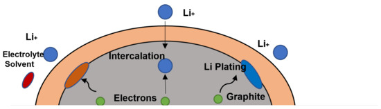 Another process that causes degradation in lithium-ion batteries is lithium plating, which is a side reaction on the surface of the negative electrode. Figure 4 depicts the electrochemical reactions during the charging process [51]. The intercalation of lithium into graphite is a desired process; however, the diffusion of electrolyte solvent across the surface film could cause the formation of new SEI. In addition, lithium metal could be deposited on the surface as the lithium plating occurs. There are two types of lithium plating: thermodynamic plating and kinetic plating. The thermodynamic plating takes place when the surface is fully lithiated [52]. Kinetic plating is usually caused by fast charging. Lithium plating can occur due to a number of factors, including cold temperatures, high state of charge, high charge current, high cell voltage, and insufficient negative electrode mass or electrochemically active surface area [53].
