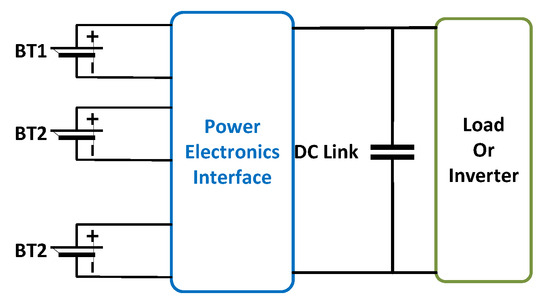 The difficulty in assembling and aggregating second-use batteries to function together in a system is the heterogeneity in their capacity and power limits, which might change as their health deteriorates. This section analyzes the power converters’ topologies and power processing architecture for SLBs to be used for energy storage purposes, which are individually heterogeneous. Various power processing architectures are compared along with power converter topologies to identify the optimal solution that ensures high reliability and efficient integration. Figure 5 shows the fundamental system structure for different capacities and types of SLBs. BTN refers to the Nth-connected battery. Matching between the source side and the DC link is performed through a power electronics interface, which is further sourced to the load or inverters for onward conversion.