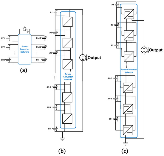 The traditional strategy for SLBs with heterogeneous characteristics is to process each battery’s power individually and to individualize each battery’s power trajectory [80]. A canonical network is presented in Figure 6a, which contains the interconnected network of batteries with the power converter network; for the new batteries that have high homogeneous characteristics, the conventional power processing (CPP) approach is adopted. The cost and power rating of the converter can be reduced with the partial power processing technique [81]. Moreover, reducing the power rating increases efficiency and lowers the thermal management cost [82]. The partial power processing architecture is shown in Figure 6b, from where it is evident that the mismatched power is processed instead of full power, which helps in reducing the power ratings. The conventional strategy for handling two BESSs is to individually process the power from each battery to adjust the heterogeneity issue, as shown in Figure 6c, termed the full power processing (FPP) architecture. The drawback of the FPP approach is that the power ratings of the converter must be at least equal to the battery ratings, leading to higher system costs as the cost is directly proportional to the power ratings. Moreover, the efficiency is also the least in this case as it heavily depends on the power converter’s efficiency. For instance, to gain the overall 99% system efficiency, the converter efficiency must be at least 99% too, which means higher cost.