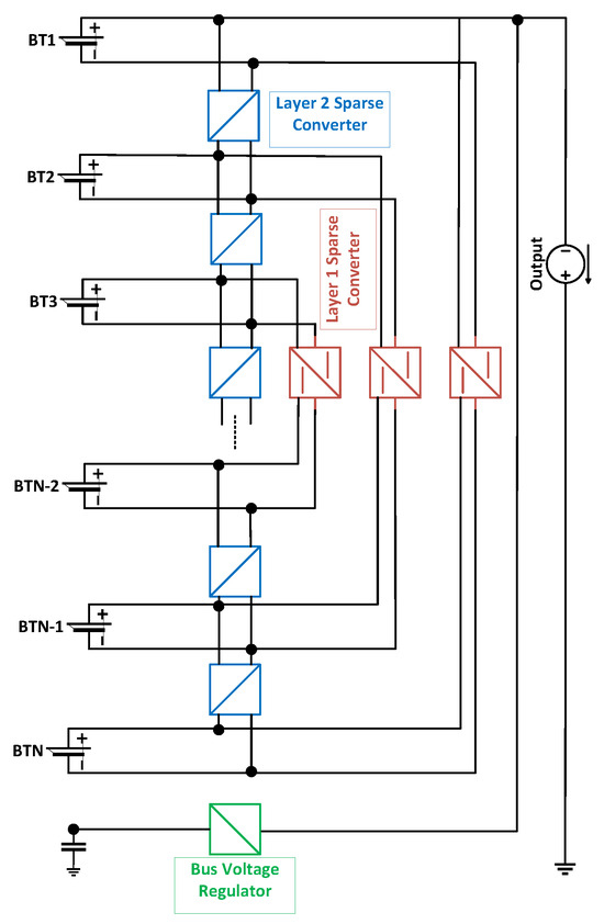 - Cui, X.; Ramyar, A.; Contreras, V.; Judge, G.; Siegel, J.; Stefanopoulou, A.; Avestruz, A.T. Lite-Sparse Hierarchical Partial Power Processing for Parallel Batteries in Heterogeneous Energy Storage Systems. In Proceedings of the 2021 IEEE 22nd Workshop on Control and Modelling of Power Electronics (COMPEL), Cartagena, Colombia, 2–5 November 2021; pp. 1–8. [Google Scholar] [CrossRef]