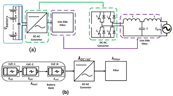 Figure 10a depicts the scenario when the number of battery cells is connected in series from a battery bank, which results in a single-stage converter topology. The reliability block diagram for the single-stage BESS is shown in Figure 10b. The reliability diagram shows that the system reliability is greatly affected by the reliability of individual cells, mathematically written as in Equation (4). This topology ensures a high efficiency of over 95%; however, the failure of a single cell can cause overall system failure. An LCL filter is utilized for the grid interconnection on the output side.
