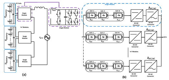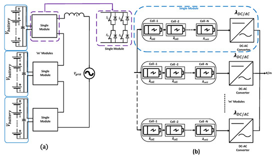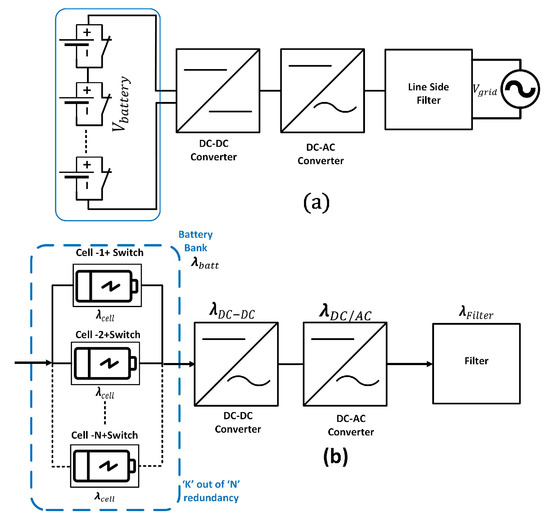 This topology’s modular design provides increased reliability. Reliability is increased as a result of fewer series-connected batteries, as evident in Figure 14a. Multiple sets of ‘m’ modules with a lower number of series-connected batteries can be formulated and connected in the cascade configuration. The overall cost of this topology will be high due to the high component count required for improved reliability. The reliability block diagram is presented in Figure 14b. The failure rate is presented in Equation (7). From the block diagram, it can be seen that for modular topologies, the reliability calculation is performed in two steps: the reliability of individual units and then the addition of the redundancy step.