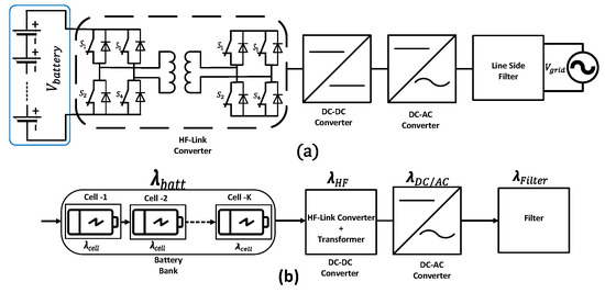The three-stage converter topology is one of the most commonly used and found in the literature. In this configuration, a high-frequency transformer is utilized for boosting purposes from the battery voltage as depicted in Figure 13a and followed by its reliability block diagram in Figure 13b.