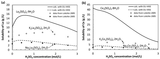 The variation of REE precipitation yield when adding Na2SO4 addition was evaluated by thermodynamic modeling using the OLI studio module (v11.0) of the OLI Systems software. This program implements the mixed-solvent electrolyte (MSE) model for concentrated electrolyte solutions [36]. The OLI–MSE database includes a specific thermodynamic description of the system’s rare earth sulfates/sodium sulfate/sulfuric acid /water [37] and is thus well adapted to represent the chemical system. As illustrated in Figure 2, the calculated solubility of monohydrated sodium–lanthanide double sulfate salts Na2REE2(SO4)4·2H2O (with REE = La and Ce) in aqueous solution with various contents of H2SO4 at 25 °C reproduces the experimental data from the work by Lokshin et al. [40]. However, as later discussed in this article, the model does not integrate the potassium double sulfate salts KREE(SO4)2·H2O, which possess an intermediate solubility level between sodium double sulfate salts and simple REE sulfates (LaSO4·9H2O and CeSO4·8H2O).