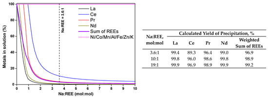 As shown in Figure 3, which presents the calculated proportion of the element in the aqueous phase versus the molar ratio Na:REE, the precipitation of REEs is expected to be a highly selective process, as no element other than Na and REEs should precipitate. In agreement with Equation (1), the calculations indicate the formation of four monohydrated sodium–lanthanide double sulfate salts with the form NaREE(SO4)2·H2O (REE = La, Ce, Pr, Nd). Due to slight differences in equilibrium constants, the calculations predict that the elements should precipitate in the following order: La first, then Nd, Pr and Ce.