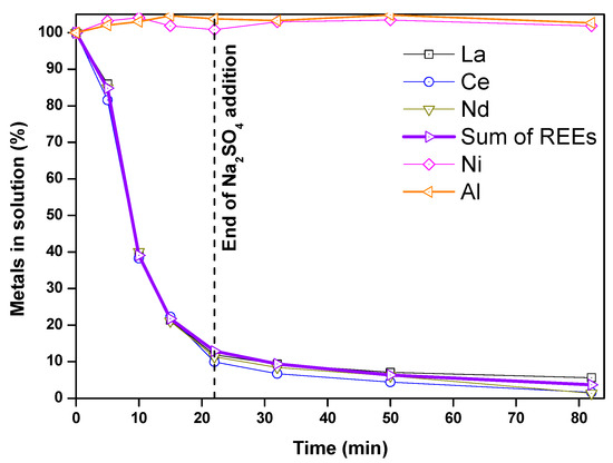 Figure 4 shows the evolution of REE precipitation yields with time (100-%Yi(t), derived from Equations (2) and (3)) for the standard conditions. After 80 min, the experimental yields were 95.7 ± 0.2 mol% for La, 98.8 ± 0.3 mol% for Ce and 99.1 ± 0.2 mol% for Nd. The total yield of REEs reached 96.3 ± 0.2 mol%. The time evolution revealed that REEs precipitated with a short (<10 min) induction time, and that the majority of precipitation (>90%) occurred by the end of Na2SO4 addition. Furthermore, in contrast with equilibrium calculations, the precipitation appeared to be simultaneous for all REEs.