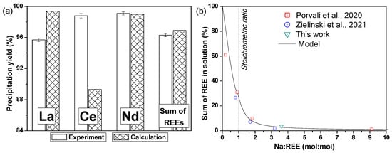 (a) Comparison of experimental and calculated yields of precipitation of rare earth elements after standard precipitation experiment (60 °C, 7 g/min of 2.87 mol/L Na2SO4, Na:REE = 3.6:1, 550 rpm, 1 h of ripening) and (b) comparison between calculated and experimental amount of REEs in solution as a function of the Na:REE molar ratio (with exp. data from [31,35]).