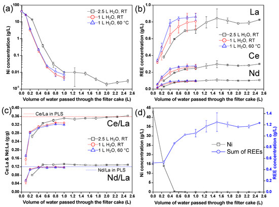 Concentrations (g/L) of (a) Ni and (b) REEs in filtrates during filtration-washing steps. (c) Ce:La and Nd:La ratios (g/g) in the filtrates. (d) Comparison of Ni and REE concentrations in the filtrates during washing by 2.5 L of H2O.