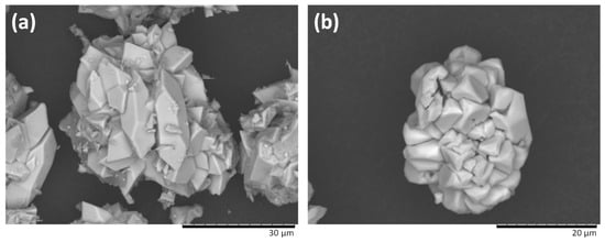 Microscopic observation and qualitative elemental analyses were performed by scanning electron microscopy (SEM) and energy dispersive spectroscopy (EDS) analysis (JSM-7100F field emission gun SEM attached with EDS Oxford ASDD X-Max 50 mm2, Les Ulis, France). The solid samples were deposited on carbon tape for direct SEM observation. In order to implement EDS analysis, a compacted tablet was prepared by applying around 5 tons on 0.5 g of powder placed in a cylindrical compaction mold. Then, the tablet was embedded in a non-conductive phenolic resin, leaving an open, smooth and dense surface of the sample for EDS analyses.