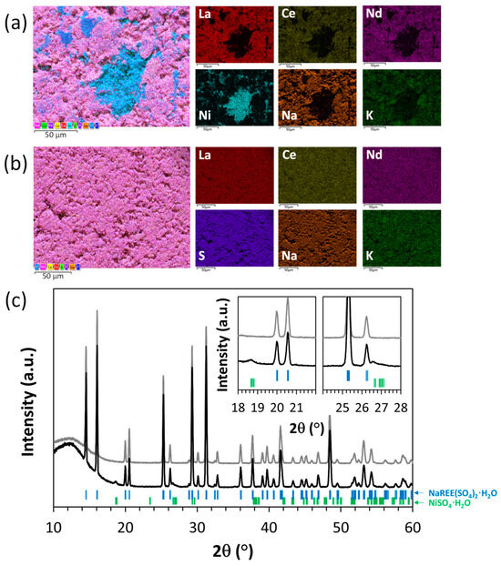After the initial washing, some REEs were entrained in the washing solutions (Figure 7b) due to partial re-dissolution of the solid product. Indeed, the concentration of REEs increased in the first steps and was then constant (at about 1.2 g/L for the sum of REEs) once the Ni washing was completed. The total losses of REEs in the filtrate after washing with 1 L of H2O were about 5 wt% of the initial quantity of REEs in the solid phase (1 g of 19.4 g in the filter cake). For a washing volume of 2.5 L, the losses increased up to 15 wt% (3 g of 19.4 g in the filter cake). Furthermore, as shown in Figure 7b, the increase in water temperature up to 60 °C did not significantly modify the REE redissolution. This indicates that the washing step did not reach thermodynamic equilibrium, as the solubility of REE double sulfate salts is significantly lower at 60 °C than at 25 °C. Indeed, according to the data compiled by Das et al. [37], the solubility of REE double sulfate salts in pure water is divided by two between 25 and 60 °C.