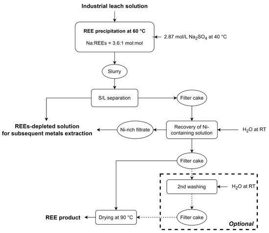 As illustrated in Figure 7d, the main conclusion related to the implementation of the washing operation is that determining the quantity of washing water is crucial to reaching maximum nickel removal while minimizing the losses of REEs caused by re-dissolution.