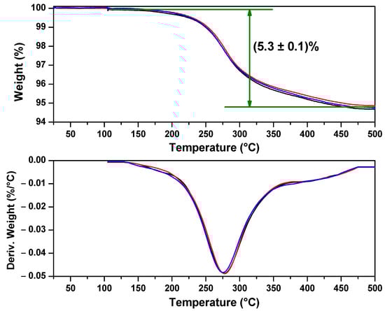 TGA curves of 3 samples (blue, red and black lines) of washed Na–REE double sulfate salts (N2, 10 °C/min, isothermal at 105 °C and 500 °C for 15 min).
