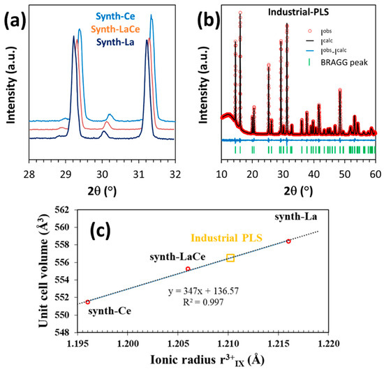 As illustrated in Figure 12c, the product obtained from the industrial PLS, which contains Pr and Nd in addition to La and Ce, also agrees well with Vegard’s law. Indeed, the experimental measurement of its unit cell volume indicated in Table 6 (with the corresponding refinement analysis given in Figure 12b) enables one to determine an average radius of = 1.210 Å.