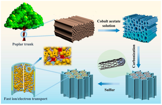 Recently, various sustainable precursors have been explored for their cost-effectiveness in electrode production [35,36,37]. Wood, acknowledged as a renewable biomass resource, emerges as an appealing choice for the creation of robust, self-supporting carbon electrodes. This preference is rooted in its inherent qualities, including a naturally layered and porous structure, exceptional mechanical strength, and minimal bending curvature [38,39]. These distinctive qualities position wood as an ideal starting material for the development of advanced electrode systems. One illustrative example of the potential of wood-derived materials is found in the work of Hu et al. They successfully engineered a low-tortuosity carbon framework (CF) characterized by high conductivity and low weight by directly carbonizing natural wood. This CF served as an ultrathick electrode host, leading to the realization of high-capacity LIBs with remarkable performance characteristics [40]. In this work, poplar wood was thoughtfully chosen as the precursor material for the creation of a wood framework (WF) host. To augment the affinity between carbon and LiPSs, this WF underwent a process of embellishment with nitrogen and oxygen co-doped carbon nanotubes (N, O-CNT). This enhancement resulted in the formation of a CNT forest grown at the tips of the WF (WF-CNT). Remarkably, thanks to its outstanding conductivity and enduring wood-like structural integrity, this composite material can function as an accommodating host for high sulfur loading, labeled as S@WF-CNT. Notably, this design eliminates the necessity for conventional components such as a current collector, conductive additives, or binders in the cathode assembly via a facile method. The distinctive S@WF-CNT cathodes are characterized by their low-tortuosity microchannels, a feature that significantly reduces the diffusion pathways for both ions and electrons. This architectural choice not only facilitates the unrestricted movement of the electrolyte within the cathode but also adeptly manages the volumetric changes associated with the sulfur component. Furthermore, the internal N, O co-doped CNT forests play a pivotal role in effectively capturing soluble LiPSs and catalyzing their redox reactions within the electrode, attributed to the nonpolar–polar interaction. As a result, the S@WF-CNT-800 sample exhibits an initial discharge capacity of 1438.2 mAh g−1 and delivers a high capacity of 588.6 mAh g−1 after 100 cycles at a high current density of 0.5 A g−1. Furthermore, S@WF-CNT-800 electrodes with impressive areal sulfur loading of 5 and 10 mgs cm−2 can be achieved. A reversible capacity of 404.5 mAh g−1 is obtained after 500 cycles with a sulfur loading of 5 mgs cm−2 at 0.5 A g−1. This approach provides valuable insights for advancing the development of high-energy-density Li-S batteries through a straightforward method utilizing biomass precursors.
