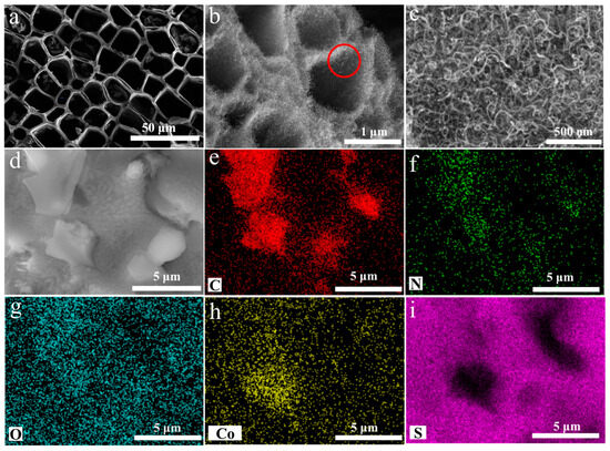 In order to comprehensively explore the influence of varying heat temperatures on the material morphology, a systematic SEM analysis was carried out, which is illustrated in Figure 2a–c, Figures S1 and S2. Throughout this examination, it became evident that the porous structure of the poplar wood remained remarkably unchanged across all samples, irrespective of the temperature conditions applied during the fabrication process. Interestingly, at temperatures up to 600 °C, no noticeable formation of CNTs was observed within the material structure. However, as the temperature rose above 700 °C, a significant transformation became apparent, characterized by the emergence of CNT growth on the surfaces of the parallel channels. By magnifying the marked area in Figure 2b, WF-CNT-800 stood out for its formation of more consistent and longer CNT forests (Figure 2c), which effectively enveloped the walls of the parallel channels. As shown in Figure S2, the WF-CNT-800 sample comprised uniform, parallel channels with a diameter ranging from 8 to 16 μm. This notable development holds great promise as it has the potential to create additional electron transfer pathways within the material and significantly amplify the specific surface area. These enhancements, in turn, could pave the way for increased sulfur loading within the composite material, ultimately contributing to the effective mitigation of the shuttle effect of LiPSs during battery operation [41]. As the temperature was elevated to 800 and 900 °C, a notable change in the behavior of CNTs was observed, characterized by a reduction in CNT length. This alteration in CNT morphology resulted in less competitive electron transport compared to the WF-CNT-800 sample. Consequently, the WF-CNT-800 sample stood out as the most promising candidate in terms of electrochemical performance, a topic that will be further elaborated upon in the subsequent discussion. Moreover, complementary SEM energy dispersive spectroscopy (SEM-EDS) mapping images, as depicted in Figure 2d–i, provided compelling evidence of the even distribution of C, N, O, Co, and S throughout the WF-CNT-800 composite. This uniform distribution further underscored the success of the fabrication process in creating a well-balanced and comprehensive composite material, where the distinct elements were consistently distributed.
