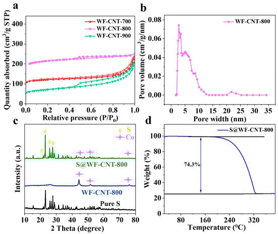 (a) Nitrogen adsorption–desorption isotherms of WF-CNT material; (b) the corresponding pore-size distribution curves of the WF-CNT-800 composite; (c) XRD patterns of pure S, WF-CNT-800, and S@WF-CNT-800 composites; and (d) TGA curve of S@WF-CNT-800 composite.