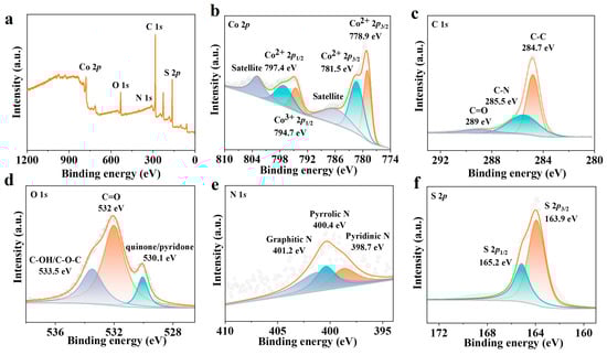 (a) Survey spectrum of S@WF-CNT-800 and high-resolution XPS spectra of (b) Co 2p, (c) C 1s, (d) O 1s, (e) N 1s, and (f) S 2p.