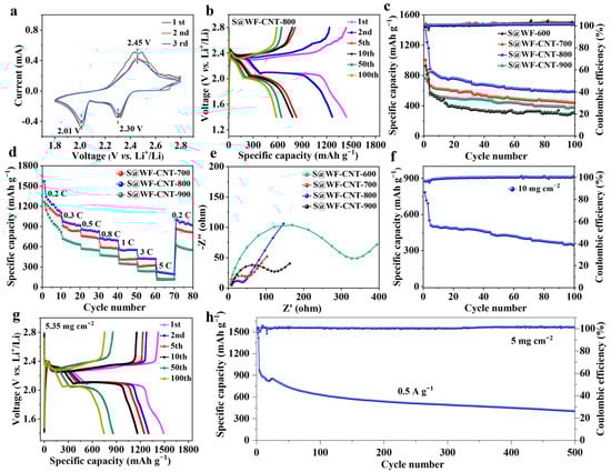 (a) CV curves of S@WF-CNT-800; (b) charge and discharge curves of S@WF-CNT-800 with sulfur loading of 2 mgs cm−2 at 0.5 A g−1; (c) cycle performance; (d) rate performance; (e) EIS curves of S@WF-CNT at different temperatures; (f) cyclability of S@WF-CNT electrodes with sulfur loading of 10 mgs cm−2 at 0.5 A g−1; (g) charge and discharge curves of S@WF-CNT-800 with sulfur loading of 5 mgs cm−2 at 0.5 A g−1; and (h) cycling performance of S@WF-CNT-800 with sulfur loading of 5 mgs cm−2 at 0.5 A g−1.