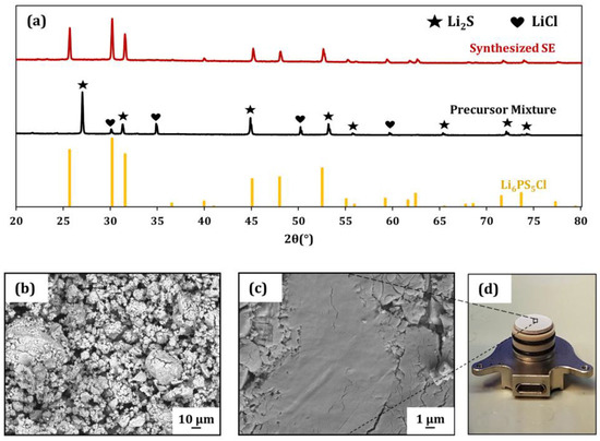 (a) XRD patterns of the precursor mixture after ball milling (black) and the corresponding pattern after reaction induced by heat treatment at 550 °C (red). Additionally, the reference pattern (ICSD: 418490) of Li-argyrodite is plotted. (b) SEM image of the synthesized solid electrolyte after heat treatment. (c) Surface of a pelletized separator. (d) Fabricated separator on the bottom current collector of the measurement cell.