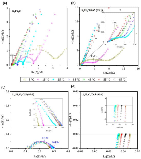Nyquist plot of the conducting matrix with (a) pure SE, (b) CM-1: 1 wt.-% C65, (c) CM-3: 3 wt.-% C65 and (d) CM-4: 4 wt.-% C65 measured between 5 and 65 °C with temperatures steps of 10 °C (7.0 MHz–1.0 Hz).