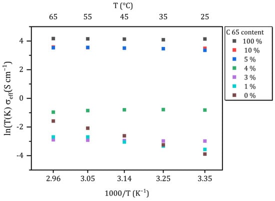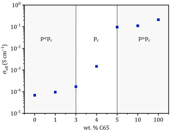 The effective conductivity of the conducting matrix at 25 °C as a function of the C65 content is plotted in Figure 5. As described before, a distinct increase in the conductivity can be observed between 3 and 5 wt.-% of C65, and the curve shows a step-like progression. This is a typical phenomenon when reaching the percolation threshold and can also be observed in different systems, such as sintering ceramics, conduction in fuel cells or carbon-nanotube-reinforced polymers, just to name a few [41,42,43]. For the interpretation of the diagram, it can be divided into two areas. In the range below the percolation threshold p < pc, the effective conductivity is close to the conductivity of the pure solid electrolyte. Above the critical conductive additive fraction p > pc, the C65 forms a percolating network that allows electronic conduction. It can be assumed that for a C65 fraction ≥ 4 wt.-%, the charge transport in the chosen experimental set-up proceeds almost exclusively by an electronic current across the network of C65 nanoparticles, as the effective conductivity is orders of magnitude higher than the ionic conductivity of the pure solid electrolyte.