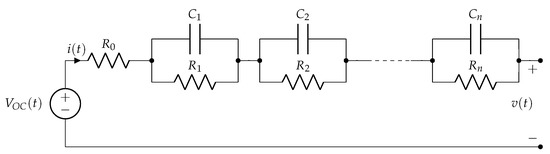 - Thevenin-based models [25,26,27,28]. These models basically consist of a real voltage source followed by a concatenation of n RC cells in series. The voltage source represents the open circuit voltage, , related to the state of charge (SOC) of the battery [29]. This model has a relatively uncomplicated design and demonstrates good accuracy in simulations [30]. In addition, it does not consider nonlinear behavior and temperature effects in batteries, although recent works are making improvements in this aspect [31]. A Thevenin-based model of n-RC order is shown in Figure 2, and its transfer function is shown in (1).