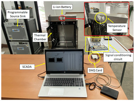 For the experimental tests, a 32 kW programmable source and sink of the Regatron TC.GSS series were used. This device allows operation in the first (source) and fourth (load) quadrant depending on the voltage set point and the current or power limits established. The electrical connection between the battery and the programmable source was made by direct connection using fuses. Due to the internal protections of the device, it was not necessary to add additional elements such as antireverse diodes. The charge and discharge profiles (current and power profiles, respectively) were previously defined in the software that includes the programmable source and executed directly on the final assembly. The measurement of the variables of interest, voltage, current and operating temperature of the battery was performed by means of specific sensors and a signal conditioning circuit designed ad hoc. For voltage and current measurements, Hall Effect sensors model LV25-P and LA25-P from LEM, respectively, were used. For temperature measurement, an NTC type thermoresistance and a conditioning circuit based on a resistive divider and zero correction circuit were used. To ensure an optimal and homogeneous measurement, the temperature sensor was placed in the center of the side face of the battery, at the opposite end of the thermal chamber heat source. The measurement obtained was compared at all times with a reference contact thermometer. The acquisition of the variables was carried out by means of a 12-bit resolution data acquisition card (DAQ) NI-USB-6008 from National Instruments. Their storage, processing and representation was carried out by means of a data acquisition and control system (SCADA) designed ad hoc and programmed in LabVIEW.The experimental setup carried out can be seen in Figure 3.