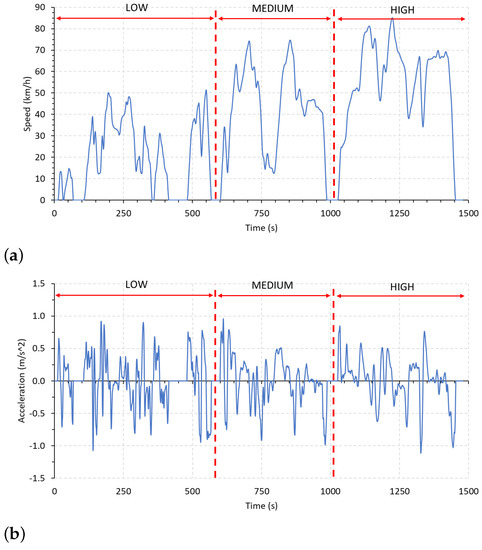 WLTP class 2 driving profile: (a) speed; (b) acceleration.
