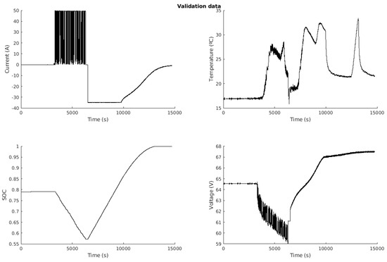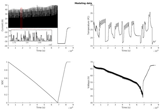 In this first phase, a set of 86508 data sampled every second was obtained from the battery voltage, current, temperature and SOC (The battery SOC was estimated by integration of the current according to the Coulomb counting method [90].). These data are shown in Figure 6.