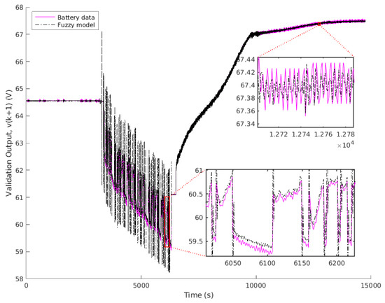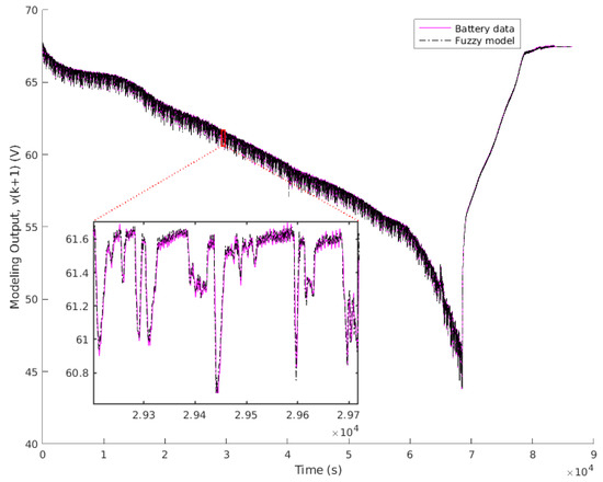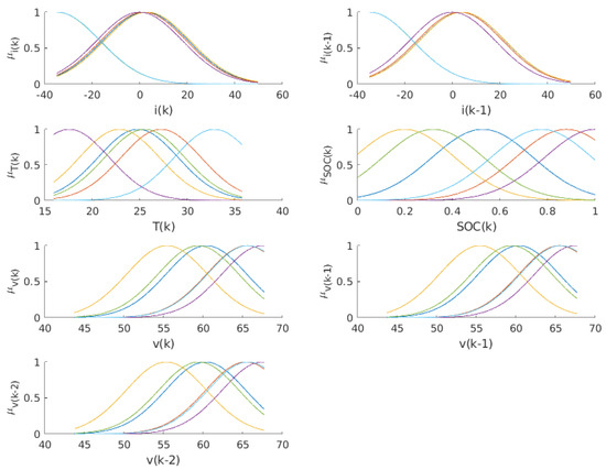 A LIB is a system whose parameters change over time due to degradation of its components or internal chemical processes, so a good prediction of its behavior requires the constant adjustment of the model. The conjunction of the Kalman algorithm with TSFM has demonstrated the ability to obtain good models while allowing to improve and adapt these models with each new data obtained from the operation of the system [60,61]. The use of such an algorithm for modeling the consequents of a TSFM based on operating data from a real LIB is presented below. It has been decided not to also adapt the antecedents of the TSFM in order to obtain a more efficient algorithm that can be executed iteratively at run time without requiring particularly fast hardware. Of course, if a more accurate model is required, it is possible to adapt the model antecedents as well [87].
