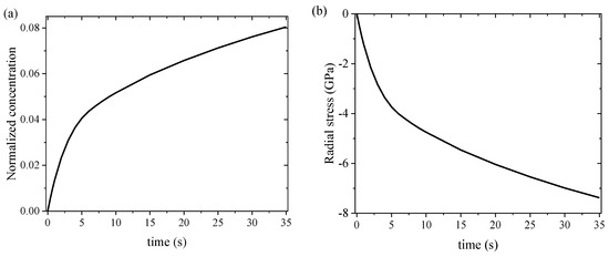 Figure 6 shows temporal evolution of the normalized concentration and radial stress at the center of the free surface. The Li concentration at the surface of the Si thin film increases with the increase in diffusion time (Figure 6a), revealing more lithium in the Si film with increasing the diffusion time. It takes only ~35 s for the Li concentration at the surface of the Si film to reach the equilibrium concentration of = 0.08. This result suggests that stage 0 ends at ~35 s with the onset of stage I. However, the radial stress near the surface is compressive, and the magnitude of the radial stress increases sharply during this short time from 0 to about 7.4 GPa (corresponding to a hydrostatic stress of −4.7 GPa and a shear stress of 3.7 GPa) (Figure 6b), slightly less than the theoretically predicted 8 GPa for the stabilization of Li-poor silicide with x ~ 0.3 [41]. The latter, i.e., the 8 GPa threshold to initiate the formation of the Li-poor phase, may be, as previously mentioned, lower in amorphous silicon and at a finite (room) temperature. This result indirectly confirms the stress-induced phase formation of Li0.3Si at the end of stage 0. Note that the large radial stress is only present around the top surface of the Si film, and most of the Si film remains in a nearly stress-free state, as revealed by the spatial distributions of the radial stress and the Li concentration in Figure 6c,d, respectively.