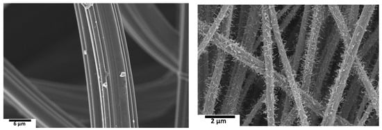 High-resolution SEM of the carbon paper CCL and graphite felt was performed and is shown in Figure 1. It is noted that carbon paper is highly porous and has a complex three-dimensional structure of carbon fibers interwoven with one another and bound by a carbon-based material (nodes) that appear as multi-layered graphite-like flakes [12]. The SEM image of graphite felt is shown in Figure 1 (left), which indicates a smooth and clean surface, as expected [33]. Felts are widely applied as electrode materials for VRFBs owing to their great stability and high conductivity under concentrated acidic conditions [33]. Their catalytic activity is restricted by the relatively low specific surface area. Thus, various treatments are utilized to modify felts to enhance the redox process via promoting active sites and/or enhancing liquid permeation and wettability. In this respect, most carbon-based catalyst materials have good electronic conductivity and a high specific surface area, such as carbon nanotubes (CNTs). This explains one of the key reasons for using a nanotube-based CCLs in combination with graphite felts as electrodes in this work. Figure 1 (right) shows the SEM image of a hierarchically designed CCL for use as an electrode. In the CCL, the random fiber alignment (non-woven) in the fabric and the presence of hair-like CNTs covering the surface of fibers can be observed. The micron-sized (~0.5 μm) fibers act as a scaffold, while the hair-like structure provides interconnectivities for potentially better electron transfer [22]. The CNTs covering the surface of fibers bear catalytic nanoparticles (Fe) and the encased catalyst nanoparticles can be observed at the tip of CNTs as well as embedded in carbon fibers. However, the stability of the Fe deposits in the acidic electrolyte (3 M H2SO4) will be limited. As a result, the material electrocatalytic performance can be solely ascribed to the carbon surface, which is significantly improved due to the presence of CNTs. This is also supported by our previous work [17] in which the capacitance of different electrodes and a CCL was investigated in pure sulfuric acid solutions, showing a significant improvement in the ECSA for the CCL- sample when compared with commercially available RFB electrodes.