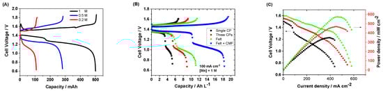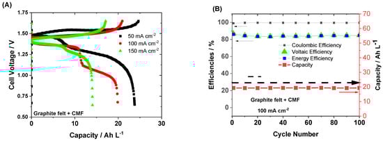 According to Houser, a larger electrode thickness causes a higher electrical efficiency, larger capacity, and current density [36]. While a larger electrode thickness increases cell repeat distance and thus decreases volumetric power density, it also results in a reduction in pressure drop that enhances electrolyte convection into the electrode. This causes larger electrolyte volume to flow into the electrode, without allowing the average electrolyte velocity to fluctuate. Thus, three layers of carbon electrode for the cathode side are employed as this would ensure a better residence time of manganese electrolyte in the electrode, allowing improved performances to be ascertained. Figure 3A illustrates the benefits of increasing the positive electrode thickness with successful operation at 100 mA cm−2 as a result of improved fluid distribution and lower mass transport overpotential. In alignment with this, it is worth mentioning that an even better performance was observed in our previous work when implementing thick graphite felt (4.6 mm). This is also validated in Figure 3B (green), which shows the performance of an H/Mn system that utilized unmodified graphite felt as a positive electrode. Besides differences in the microstructure, the SGL carbon paper has a significant amount of rough graphitic binder, which could be a residual product of the electrode carbonization process [12], and this binder occupies a large fraction of the microscale pores that partially covers the carbon fibers [37]. In contrast, the felt electrode is binder-free, realizing structural integrity through fiber entanglement, which enables a flexible and compressible media. Therefore, felt allows for better electrolyte permeation to the graphite fiber surfaces, allowing for good mass transport. In full scale systems, graphite felts are preferable as electrodes owing to their electrical resistivity being lower than carbon paper, but more importantly due to their cost, which is between 2 to 10 times less than standard carbon paper electrodes.