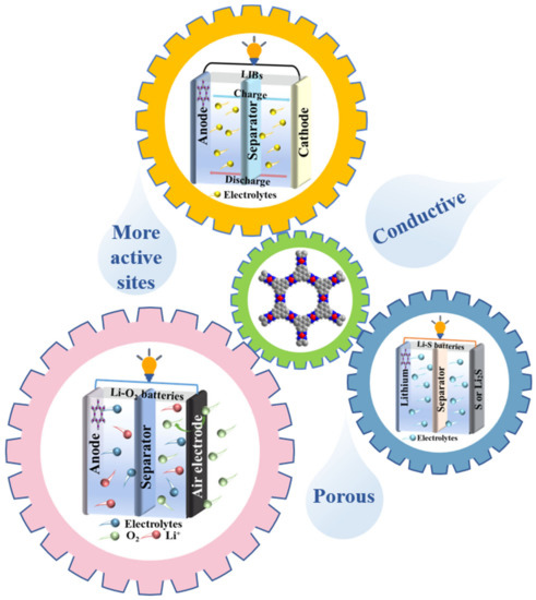 Unlike LIBs that require lithium compounds and graphite as electrodes, Li–S batteries generally use sulfur as the cathode and lithium foil as the anode, and Li–air batteries can directly use lithium and oxygen in the air as electrodes. Li–S and Li–air batteries are ascribed to an electrochemical mechanism different from the ion extraction–insertion mechanism of LIBs. Additionally, Li–S and non-liquid Li–air batteries exhibit high theoretical energy densities of 2600 and 11,200 W·h·kg−1, respectively, [102,103,104,105] compared with LIBs (250–300 W·h·kg−1) [106,107]. The following section focuses on the achievements of using c-MOFs to enhance Li–S batteries and Li–air batteries (Figure 10).