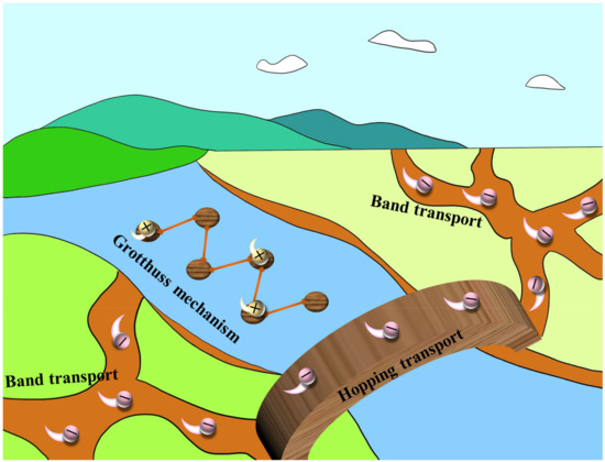 The hopping transport mechanism and the band transport mechanism are realized in the chemical construction of electronic c-MOFs through bonding, space, and guest molecules. The transport mechanisms for proton c-MOFs are realized via the Grotthuss mechanism [46,47]. Figure 4 depicts the three conductive mechanisms. The transport mechanism through a bond is dependent on a covalent bond formation. The energetic and steric overlap of organic ligands and metal ions facilitates charge transport [41,45]. In 2009, Takaishi reported Cu[Cu(pdt)2] as a typical example of the bond transport. The conductivity of Cu[Cu(pdt)2] was 6 × 10−4 S·cm−1 at 300 K, which was used as a high-power density porous electrode [48]. The charge transfer through space is mainly owing to the close packing and overlapping orbitals between adjacent ligands in rigid MOFs (such as π–π stacking between organic ligands), which is a non-covalent interaction. This solves the problem of fewer bonds between adjacent electroactive units and promotes charge transfer [49]. In 2018, Carol Hua et al. demonstrated an example of the transfer of electric charge through space. In Zn(II) frames containing cofacial thiazolo[5, 4-d]thiazole units, aromatic stacking interactions result in mixed valence states during electrochemical or chemical reduction [50]. The conduction via guest molecules introduces several guest molecules into the pore structure of MOFs to regulate the internal redox activity. Redox pairing and effective orbital overlap between the frame and guest molecules play a vital role in generating efficient charge transfer. A typical example was the immersion of MOFs Cu3(BTC)2 in methylene chloride saturated with tetracyanoquinodmethane by Yoon et al., which increased the conductivity of MOFs from 10−8 to 0.07 S·cm−1 [51]. The German chemist Theodor von Grotthuss contributed greatly to the development of the proton conduction mechanism. Hydrogen bonding is essential in this mechanism and is the key to elucidating proton transport. As a non-covalent interaction, the hydrogen bond is a weak bond formed between the hydrogen atom on the X–H (X is an atom more electronegative than hydrogen) of the molecular fragment and the same molecule or other molecules [52,53,54]. At room temperature, hydrogen bonds can form or break in response to thermal fluctuations, and that causes the transfer of protons in the Grotthuss mechanism.
